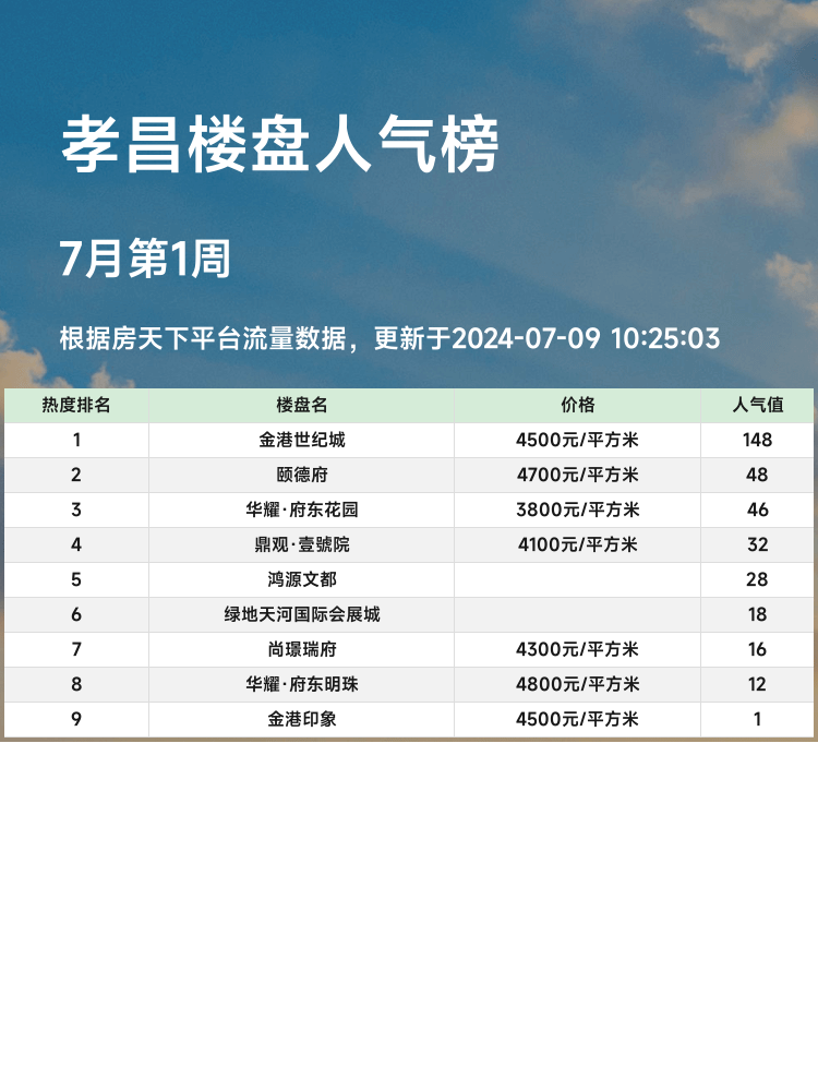 买房选房是件大事,尤其是在当前市场环境下,了解哪些楼盘最受欢迎显得尤为重要。人气楼盘榜单不仅反映了市场的热度,还可以为购房者提供有价值的参考信息。为了帮助大家更好地做出选择,今天为大家带来孝昌区域人气楼盘榜单,来看看哪些楼盘值得关注吧!