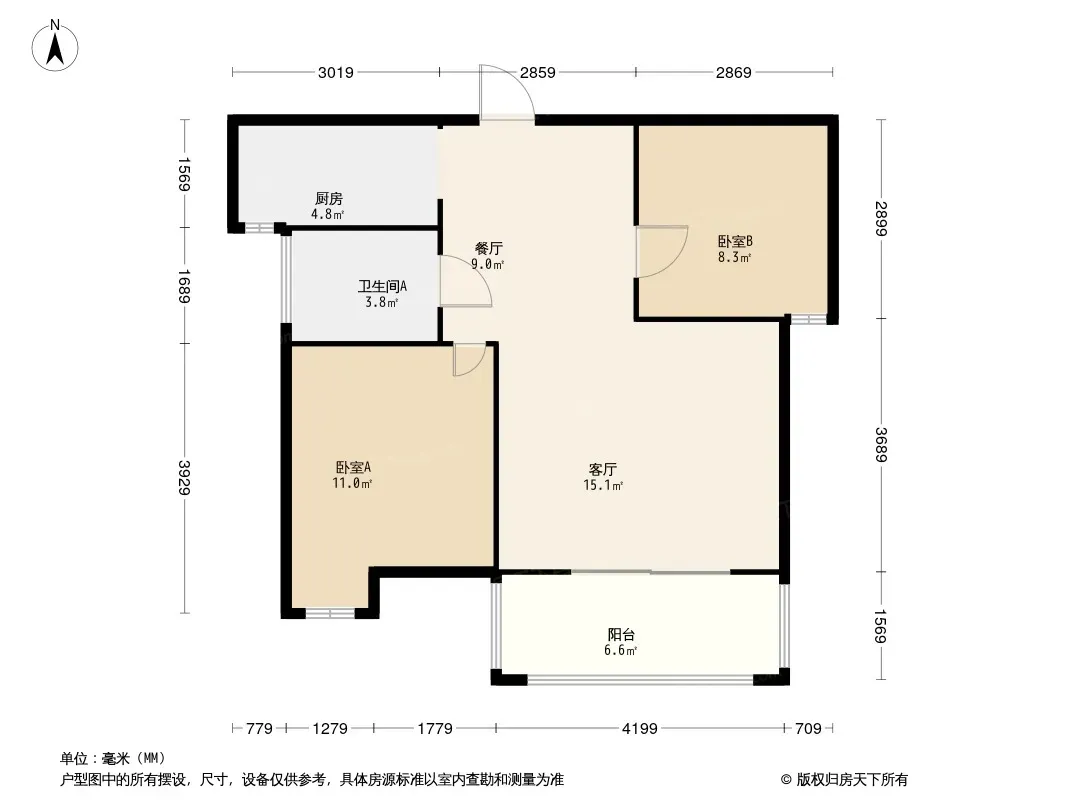 • 建面83.55㎡的温馨两居,主卧朝南带整面落地窗
