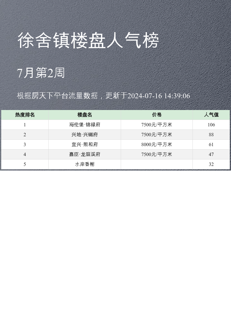 🏡 在当下的楼市中,选对楼盘至关重要❗️ 人气楼盘榜单能帮你迅速了解哪些楼盘最受欢迎,哪些楼盘性价比最高,以及它们的优缺点。今天,就为大家带来徐舍镇人气楼盘榜单,帮助你迅速找到心仪的家🏠。