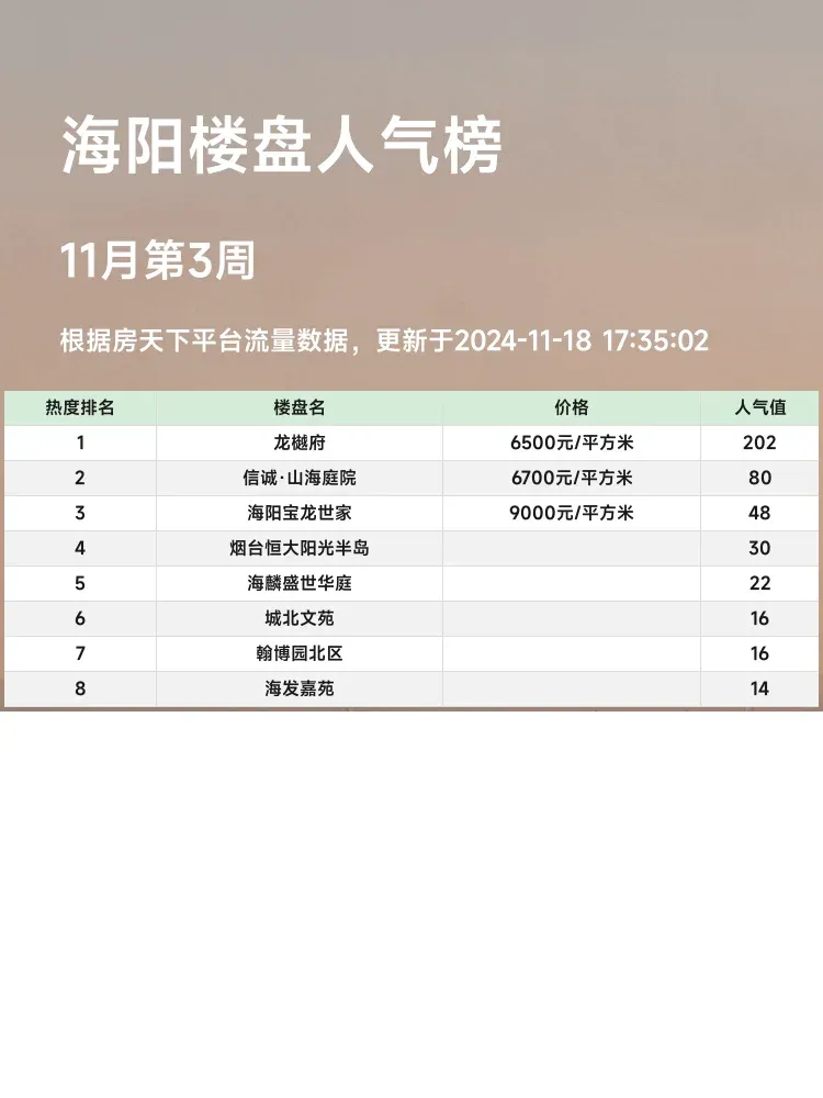 在如今这个信息爆炸的时代,选个好房子可真不容易!🏠对于购房者来说,紧盯人气楼盘榜单是个好选择。榜单不仅能揭示市场的热门选择,还能帮助我们快速找到性价比高、潜力大的楼盘。让我们来看看本月海阳最受欢迎的前三个楼盘,它们各具特色,值得一探究竟!✨