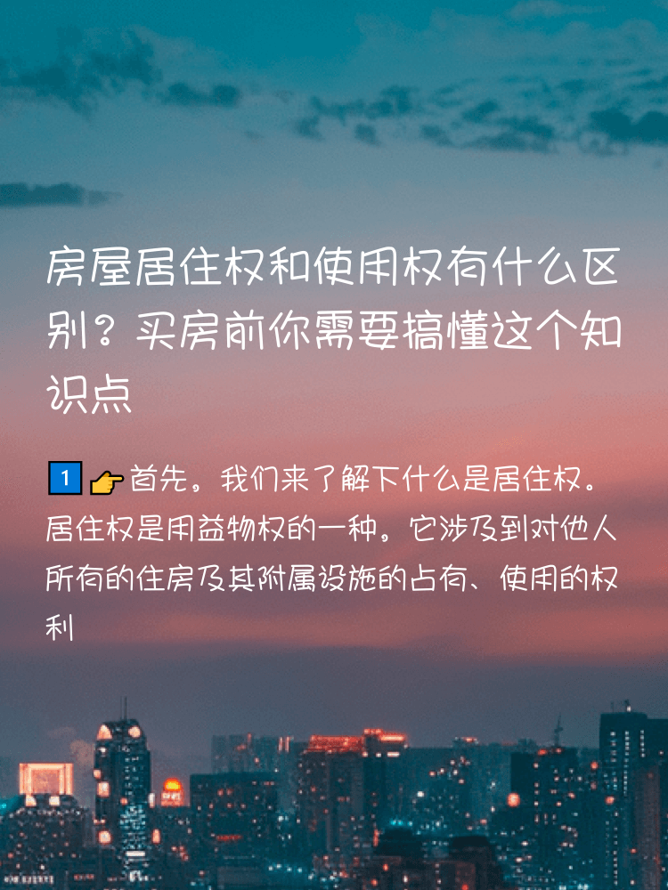 1️⃣👉首先,我们来了解下什么是居住权。居住权是用益物权的一种,它涉及到对他人所有的住房及其附属设施的占有、使用的权利。简单来说,你可以在别人的房子里居住,享受房屋带来的生活便利。🏠✨