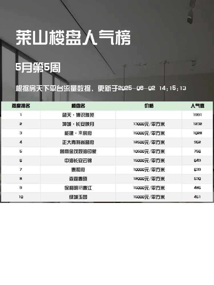 买房选房看榜单准没错!🏆 人气楼盘榜单能直观反映市场热度,帮购房者快速锁定优质项目。当前市场下,配套成熟、户型实用、性价比高的楼盘更受青睐,这份莱山最新榜单给你最实用的参考~