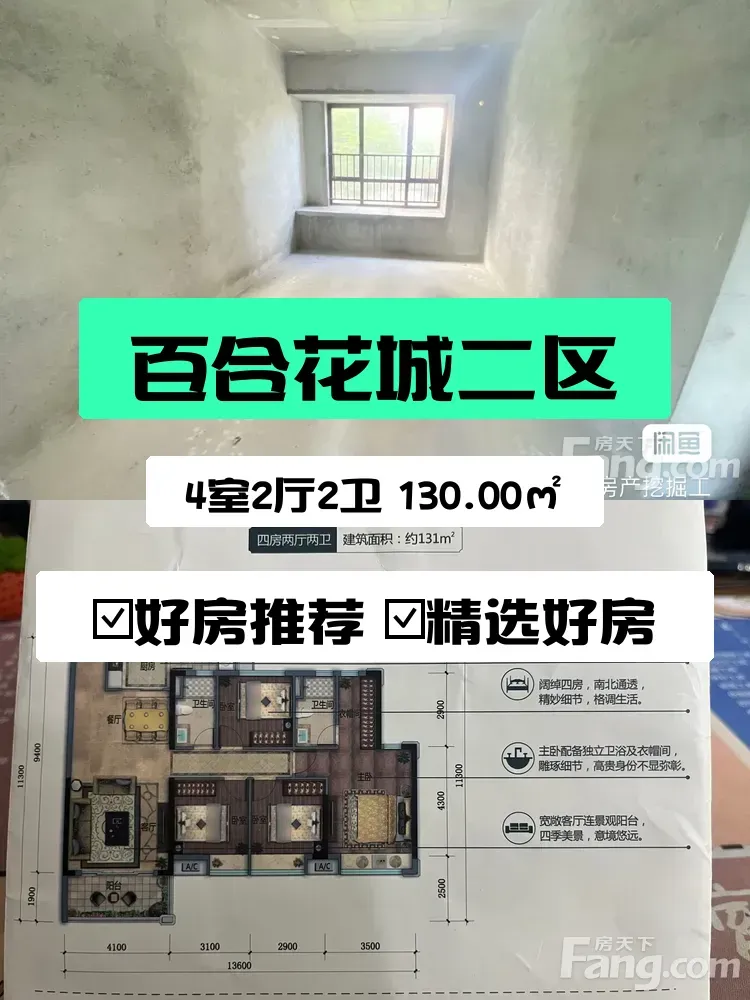 想和大家分享一下我家即将出售的房子,它位于百合花城二区,广兴大道东。这套四室两厅两卫的住宅居住非常舒适,房子面积有130平米,空间特别宽敞。楼层是13层,总共29层,朝向南北,采光和通风都非常好🌞。