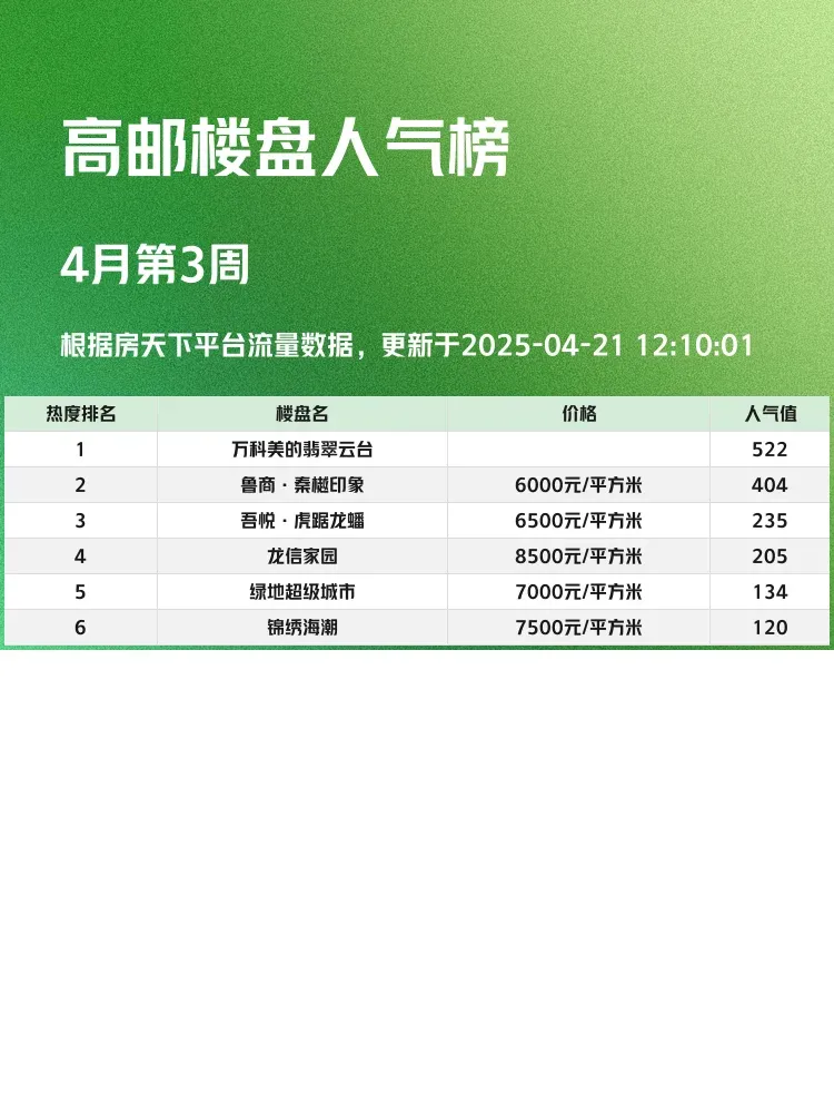 买房是人生大事,选对楼盘很关键!🔥 这份高邮人气楼盘榜单,帮你快速锁定区域热门项目。当下买房要重点关注性价比、配套成熟度和户型实用性,这份榜单正是基于这些核心指标评选出来的~