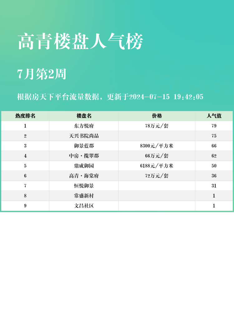 🏡购房的小伙伴们,选择一个合适的楼盘至关重要,特别是在现在房产市场格局不断变化的情况下。关注人气楼盘榜单,不仅能直观了解市场趋势,还能帮助你更精准地找到心仪的房源。今天,我们就来看看高青区域人气楼盘榜单的前三名吧!