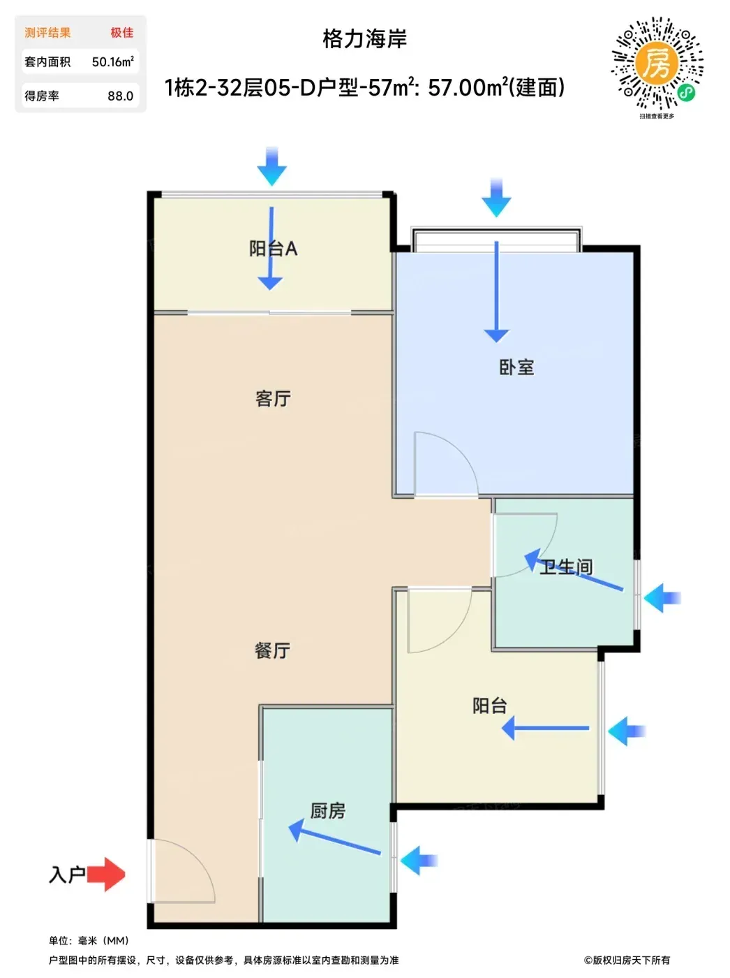 实测57㎡竟有两房!主卧能塞下1.8米床,飘窗深度够当茶台。北向总价98万,南向贵40万但能看海,刚需和精致党各取所需。
