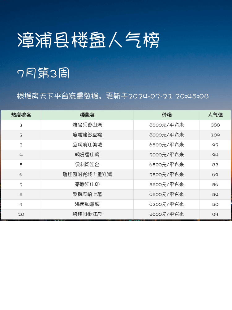 🏡在买房的过程中,关注人气楼盘榜单非常重要📊!特别是在当前市场,要选到适合的房子,需要综合考虑地段、配套、价格等多个因素。下面为大家带来漳浦县人气楼盘榜单的前3名,希望能为大家的购房决策提供有价值的信息💡。