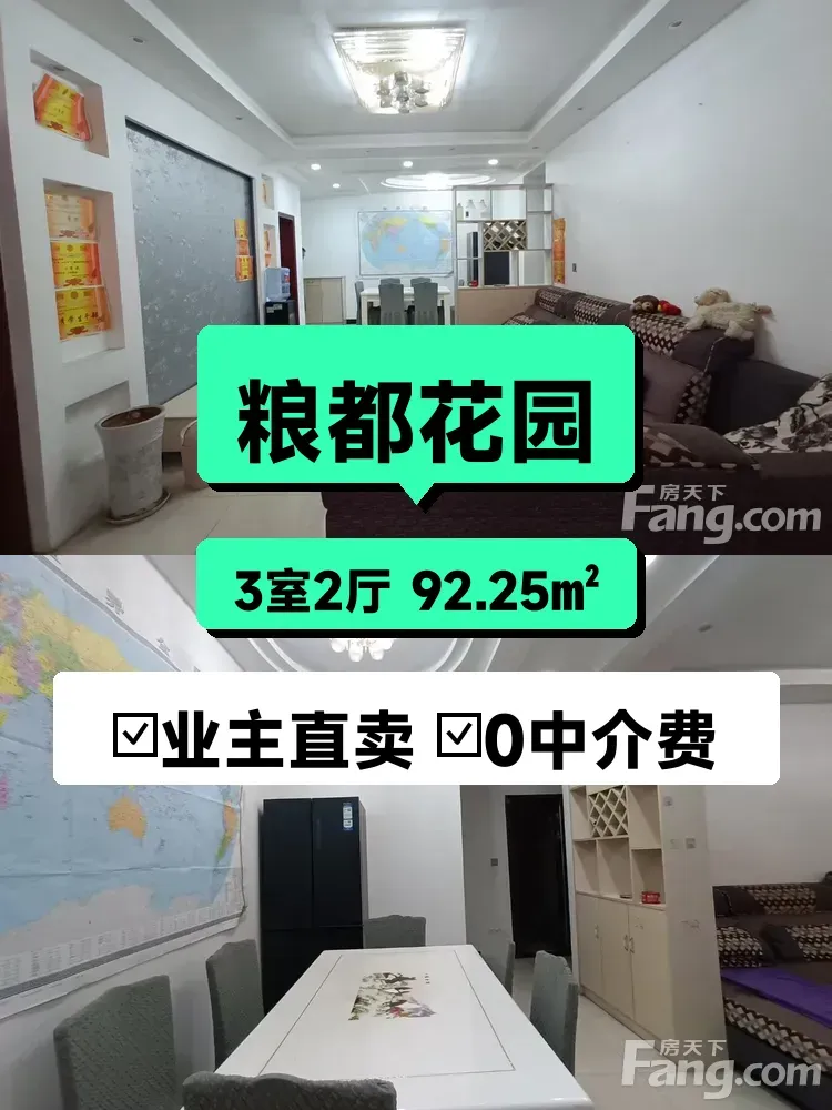 我家在粮都花园4楼(总高7层),92㎡的三房两厅,朝南采光超级棒!🌞 每天阳光洒进来,晾衣服都不用愁~小区就在解放街227号,周边菜市场、超市步行5分钟就到,生活超方便!