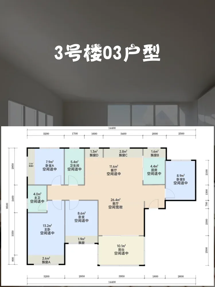 ◇ 极致紧凑:63㎡三室两厅,主卧开间3.1米,次卧2.8米,小户型多功能典范