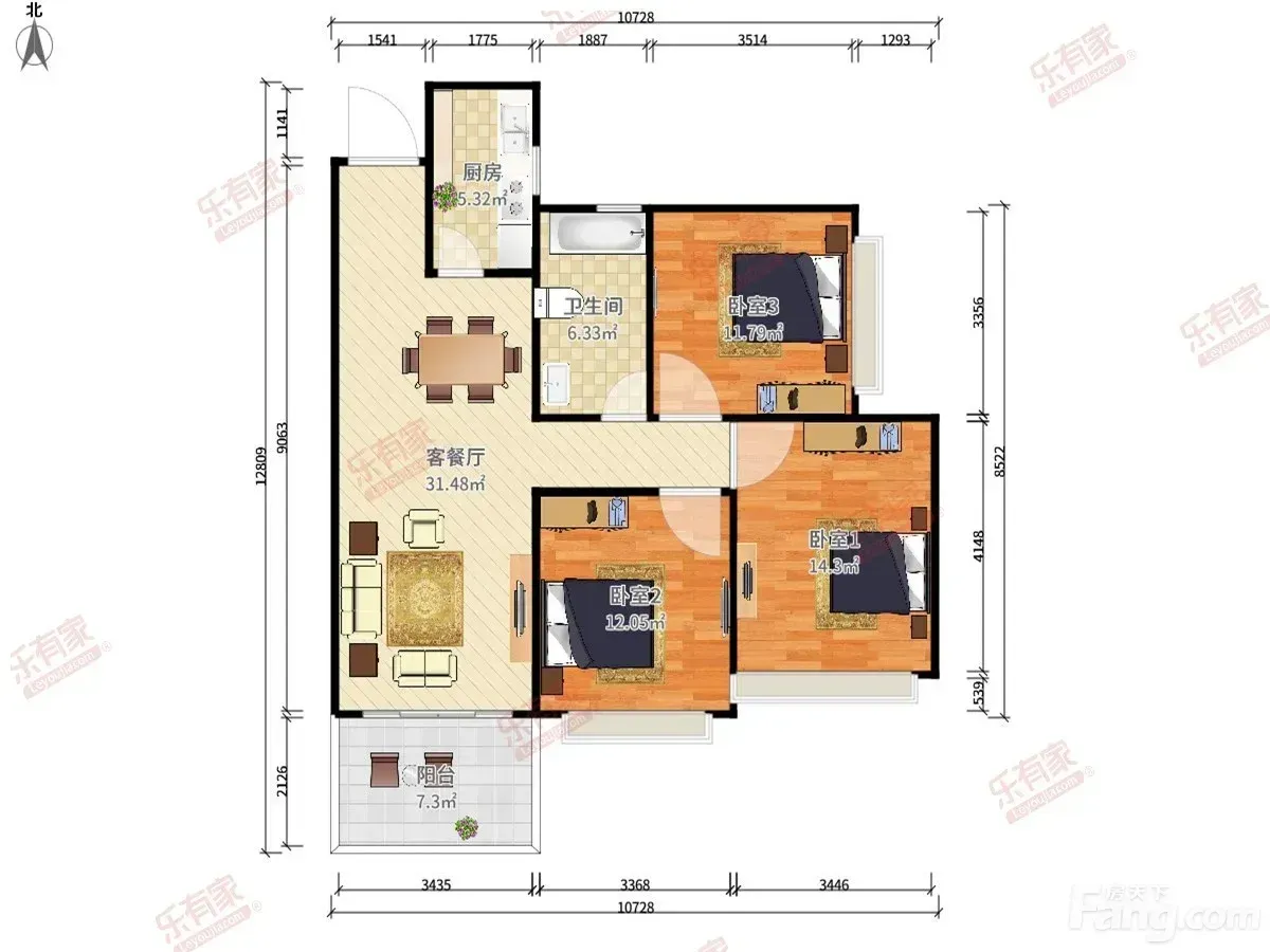 重点说说户型:三个卧室都不局促,主卧能放下1.8米大床+衣柜;客厅带大飘窗,自己改造了ins风阅读角📚;厨房U型布局,两个人同时做饭也不挤~