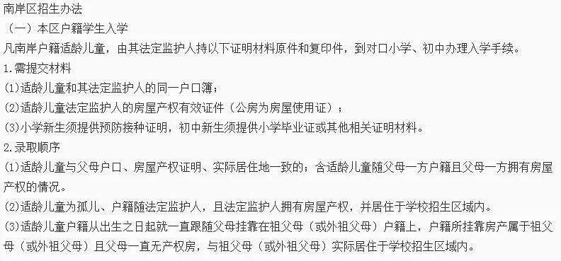 ¡¾2017ÖØÇì½ÄÏСѧÕÐÉú¼òÕ¡¿ Ò»¡¢»ù±¾ÔÔò £¨Ò»£©ÒÀ·¨ÈëѧÔÔò¡£2017 Äê 8 Ô 31 ÈÕ£¨º¬ 8 Ô 31 ÈÕ£©Ç°£¬·²ÄêÂú 6 ÖÜËê¶ùͯ£¬Ó¦µ±ÒÀ·¨½ÓÊܲ¢Íê³ÉÒåÎñ½ÌÓý¡£ £¨¶þ£©¶Ô¿ÚÈëѧÔÔò¡£½ÄÏСѧÕÐÉú·¶Î§ÄÚµÄÊÊÁä¶ùͯÈëѧʵÐС°Èý¶Ô¿Ú¡±ÔÔò¡£ ¼´ÊÊÁä¶ùͯÓë·¨¶¨¼à»¤ÈË»§¼®Ò»Ö¡¢»§¼®µÇ¼ÇµØÓëÊÊÁä¶ùͯ¡¢·¨¶¨¼à»¤ÈËʵ¼Ê¾ÓסµØÒ»Ö£¬¾ÓסµØÓë·¨¶¨¼à»¤ÈË·¿ÎݲúȨһÖ¡£ £¨Èý£©¹æ·¶¹«Æ½ÔÔò¡£·ûºÏÎÒУ¡°Èý¶Ô¿Ú¡±ÈëѧÌõ¼þµÄÊÊÁä¶ùͯÃâÊÔÈëѧ¡£½¨Á¢ºÍÍêÉÆÕÐÉú¹«Ê¾Öƶȡ¢×ÉÑ¯ÖÆ¶ÈºÍÉç»á¼à¶½Öƶȡ£ÊµÐС°Ñô¹âÕÐÉú¡±£¬×öµ½ÐÅÏ¢¹«¿ª¡¢»ú»á¹«Æ½¡¢½á¹û¹«Õý¡£¶þ¡¢ÕÐÉú·¶Î§ ½ÄÏСѧÕÐÉú·¶Î§Ö÷ÌåÓëÍùÄêÒ»Ö£¬ÏêÇé×ÉѯÕÐÉú°ì¹«ÊÒ¡£ Èý¡¢ÕÐÉú°ì·¨ ·²·ûºÏÎÒУÕÐÉúÌõ¼þµÄÊÊÁä¶ùͯ£¬ÓÉÆä·¨¶¨¼à»¤ÈË×¼±¸ºÃÒÔÏÂÖ¤Ã÷²ÄÁϵÄÔ¼þºÍ¸´Ó¡¼þ£¬µ½½ÄÏСѧ°ìÀíÈëѧµÇ¼ÇÊÖÐø¡£ £¨Ò»£©»§¿Ú±¡£ºÊÊÁä¶ùͯÓëÆä·¨¶¨¼à»¤È˵Äͬһ»§¿Ú±¡Ô¼þ¼°¸´Ó¡¼þ 1 ·Ý£¨¸´Ó¡£º»§¿ÚµØÖ·Ò³¡¢»§Ö÷Ò³¡¢º¢×Ó¸¸Ç×Ò³¡¢º¢×ÓĸÇ×Ò³¡¢º¢×ÓÒ³¡¢»§¿ÚÔö¼õÒ³£¬¿É¸´Ó¡ÔÚÒ»ÕÅ A4 Ö½ÉÏ£© £¨¶þ£©·¿²úÖ¤£ºÊÊÁä¶ùͯ·¨¶¨¼à»¤È˵ķ¿ÎݲúȨÓÐЧ֤¼þ£¨¹«·¿Îª·¿ÎÝʹÓÃÖ¤£©Ô¼þ¼°¸´Ó¡¼þ 1 ·Ý£»°´½Ò·¿µÄ×¼±¸¹º·¿ºÏͬ¡¢µÖѺºÏͬԼþ£¬·¿²úÖ¤¸´Ó¡¼þ 1 ·Ý¡£ £¨Èý£©³öÉúÖ¤£º¶ùͯµÄҽѧ³öÉúÖ¤Ã÷Ô¼þ¼°¸´Ó¡¼þ 1 ·Ý¡£ £¨ËÄ£©¾Óס֤Ã÷£ºÉçÇø»òÕßÂ¥ÅÌÎï¹Ü³ö¾ßµÄ¾Óס֤Ã÷¡£ £¨Î壩ÎÞ·¿Ö¤Ã÷£ºÊÊÁä¶ùͯÈçÒò·¨¶¨¼à»¤ÈËÎÞ×Ô¹º·¿£¬×Ô³öÉúÈÕÆð»§¼®Ò»Ö±¹Ò¿¿×游ĸ£¨Íâ׿¸¸Ä¸£©·¿²ú´¦£¬²¢Ó븸ĸ¡¢×游ĸ£¨Íâ׿¸¸Ä¸£©ÔÚÕÐÉú·þÎñÇø³£×¡µÄ£¬±¨ÃûʱÐèÇøÍÁµØ·¿ÎÝȨÊôµÇ¼ÇÖÐÐijö¾ßµÄÊÊÁä¶ùͯ·¨¶¨¼à»¤ÈË£¨¸¸Ä¸Ë«·½£©ÎÞ·¿Ö¤Ã÷£¬Òò¸¸Ä¸ÀëÒì¶øÖ»Äܳö¾ßµ¥Ç×ÎÞ·¿Ö¤Ã÷µÄ£¬»¹Ðè³öʾ¸¸Ä¸Àë»éÖ¤ºÍ×ÓÅ®¸§ÑøµÄÖ¤Ã÷¡£ ËÄ¡¢ÕÐÉú³ÌÐò¡¢Ê±¼ä¡¢µØµã £¨Ò»£©ÕÐÉú³ÌÐò£º±¨ÃûµÇ¼Ç¨DÉó²éºËʵ¨D¹«²¼½á¹û¨D·¢Èëѧ¼ȡ֪ͨÊé £¨¶þ£©±¨ÃûµÇ¼Çʱ¼ä£º¼¯Öб¨Ãûʱ¼äΪ 2017 Äê 6 Ô 22 ÈÕ£¨ÉÏÎç 8£º00-12£º00£»ÏÂÎç 2:00-5:00£© £¨Èý£©±¨ÃûµÇ¼ÇµØµã£º½ÄÏСѧ £¨ËÄ£©ÊÊÁä¶ùͯ±¨ÃûµÇ¼Ç£¬¾Ñ§Ð£ÕÐÉú²¿ÉóºË×ÊÁÏ£¬±¨ËÍÅÉ´¦ËùºÍ·¿¹Ü¾Ö½øÐк˶ԣ¬ÉóºËͨ¹ýºó¹«²¼½á¹û£¬·¢Èëѧ¼ȡ֪ͨÊé¡£Îå¡¢°²È«±£ÕÏ Ñ§Ð£ºóÇÚ²¿¼°Ð£Ô°±£°²¡£ Áù¡¢Ïà¹ØÊÂÒË £¨Ò»£©Ç뺢×ÓµÄÖ±½Ó¼à»¤È˰´±¨Ãûʱ¼ä£¬´øÆëÏà¹Ø×ÊÁÏ£¬µ½½ÄÏСѧ½øÐб¨ÃûµÇ¼Ç¡£ £¨¶þ£©ÌṩµÄ±¨Ãû²ÄÁÏÎñ±ØÕæÊµÓÐЧ£¬ÈôÓÐŪÐé×÷¼Ù£¬Ò»¾²éʵ£¬ºó¹û×Ô¸º¡£ £¨Èý£©ÌرðÉêÃ÷£ºÑ§Ð£Ã»ÓÐίÍÐÈκÎÉç»á»ú¹¹ºÍ¸öÈË´ú°ìÐÂÉú±¨Ãû¹¤×÷£¬Î¨Ò»ÓÐЧµÄ±¨Ãû;¾¶ÊÇѧУÕÐÉú²¿¡£ £¨ËÄ£©Î´¾¡ÊÂÒËÒÔÇø½ÌίºÍѧУ½âÊÍΪ׼¡£ ÕÐÉú×Éѯµç»°£º62776131 ÁªÏµÈË£ºÌÆÀÏʦ