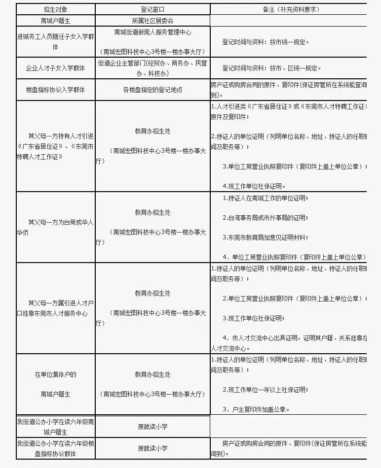 根据《中华人民共和国义务教育法》的精神和《关于做好东莞市2016年义务教育阶段学校招生工作的通知》要求,结合我街道实际情况,小学按照“户籍人口,就近入学;楼盘指标,合理调配;政策入读、插班入学,统筹安排” 的原则安排适龄儿童入读我街道公办小学;初中采用“电脑派位”方式安排入读南城中学或阳光实验中学。 一、招生对象 小学一年级须年满6周岁(2009年9月1日-2010年8月31日出生)、初中一年级须为小学六年级应届毕业生,有正常学习能力,且符合以下条件之一的适龄儿童、少年,为我街道公办中小学新生招生对象。 1.南城户籍的适龄儿童、少年 2.进城务工人员随迁子女入学群体 按《东莞市新莞人子女接受义务教育实施办法》(东府[2012]67号)和《2016年东莞市义务教育阶段进城务工人员随迁子女积分制入学积分方案》执行。 3.企业人才子女入学群体 按《东莞市企业人才子女入学暂行办法》(东府办[2013]49号)和《南城街道奖励企业人才子女入读公办学校暂行办法》(南城办[2015]7号)执行。 4.楼盘指标入学协议群体 楼盘指标协议群体指的是与我街道办事处签有委托办学协议并符合入读条件的楼盘业主适龄子女,将按照《关于楼盘业主子女入读公办学校规范管理工作的通知》(南城办[2013]36号)执行。 5.东莞市优惠政策群体 (1)其父母一方在我街道工作,持有属于广东省人才引进签发的有效《广东省居住证》(有效期3 年及以上)、持有《东莞市特聘人才工作证》的适龄子女,按照《东莞市新莞人子女接受义务教育实施办法》 (东府[2012]67号)中第九条优惠政策执行。 (2)其父母一方在我街道工作,持有东莞市台湾事务局出具的《东莞市台湾人士子女入学证明》的适龄子女,按东教基[2006]20号规定执行;其父母一方在我街道工作,持有东莞市外事局出具《东莞市华侨华人子女入学证明》的适龄子女,按照东教基[2008]8号规定执行。 (3)其父母一方在我街道工作,属引进人才户口挂靠东莞市人才服务中心,并在工作单位购买社会养老保险满一年的适龄子女,按东府办函[2006]174号规定执行。 (4)其它符合国家、省、市优惠政策或特殊群体入学的。 二、招生流程 统一时段窗口登记、初审、公示――职能部门对登记入学资料进行资格审核――到校办理报名入学手续。 三、登记办法 (一)登记时间:2016年4月15日至25日 (二)所需材料: 1.户口簿原件及其复印件(有户号和地址的一页,父、母与儿童本人的一页,用A4纸)。 2.小孩出生证原件、复印件。 3.插班生需现时在读学校出示的国平台《学籍基本信息》卡上加意见并盖章。 4.填报《2016年南城街道秋季申请入读中小学登记表》。 四、报名办法 (一)小学报名办法 1.录取查询:2016年5月19―20日由登记窗口公布名单;家长向登记窗口查询录取结果。 2.报名时间:2016年5月21日8:30―11:00、14:00―16:30 3.报名地点:见录取结果公布的公办小学 4.报名材料:户口簿正本及其复印件(有户号和地址的一页,父、母与儿童本人的一页,用A4纸),小孩出生证原件与复印件, 登记回执。如是插班生需现时在读学校出示的国平台《学籍基本信息》卡上加意见并盖章的复印件。 (二)初中报名办法 1.入围查询:2016年6月20―24日由登记窗口公布入围名单;家长向登记窗口查询入围结果。 2.电脑派位:小学毕业考试结束后的第2天在阳光五小电脑派位。 3.发放通知:小学毕业考试结束后的第3天下午家长向原登记窗口领取学校录取通知书。 4.报名时间、地点、材料要求:见学校录取通知书 五、招生说明 1.申请人对所提交的材料真实性负责,如查出有弄虚作假一律取消入学资格,申请人并承担相应的责任。 2.楼盘指标协议群体入读名单要在所在楼盘公示5天以上,接受业主监督。 3.户口簿与监护人信息由公安户政部门通过全国户政网审核,楼盘指标协议群体的房产信息由房管所审核,优惠政策群体的证件信息由教育办会同发证机关审核,非南城户籍生的出生证件信息由计生部门通过全国、全省计生平台审核,学籍信息由教育部门通过全国学籍平台审核。 4.义务教育阶段已建立全国统一学籍档案管理平台,申请小学必须在6周岁入一年级的基础上符合相对应的年级年龄,否则平台上入不了学籍,由申请人承担责任后果。 5.已是小学、初中在校生不能申请留级重读,如入学后审核发现留级重读所造成不能办理学籍档案的,由申请人承担责任后果。 6.符合条件登记的学生,请按以上分类窗口登记,不要重复登记。 7.对未按规定时间办理登记手续的南城户籍生,补登记手续于2016年8月18日(上午8:30-11:00,下午2:00-5:00)在教育办办理。由我办根据学位情况统筹安排入读。 8.聋哑和弱智儿童到东莞启智学校报名。详情请阅《东莞市启智学校招生简章》(东莞市莞城区东城南路6号,咨询电话:22481020 22329020 )。 9.相关招生信息与表格可登陆南城街道网市民办事教育栏目、南城教育信息网政策法规栏目了解、下载。 南城街道网:http://nancheng.dg.gov.cn/ 南城教育信息网:http//ncjy.dgjy.net/ 10.本招生通知由南城街道教育办负责解释。 南城教育办招生处咨询电话:22990206 南城街道新莞人服务管理中心咨询电话:23198900 南城街道计生办咨询电话:22413009 南城街道教育办 2016年3月18日
