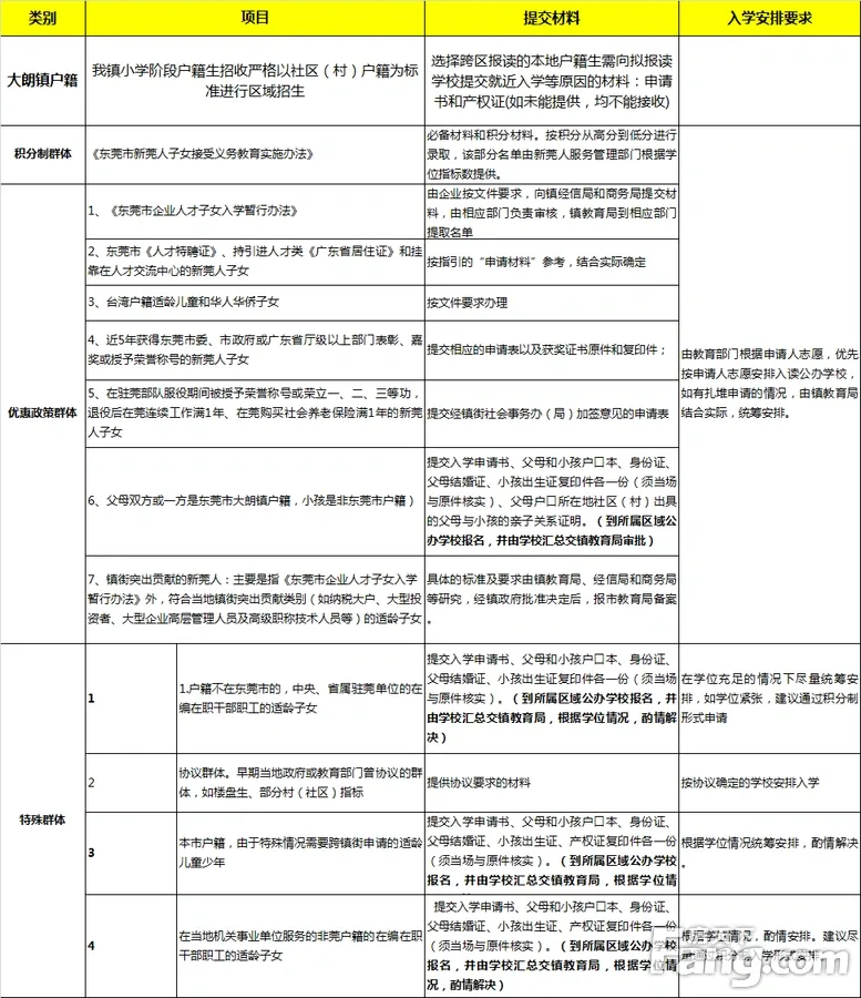 大朗镇小学2017年秋季一年级新生招生简章 二O一七年秋季大朗镇小学新生招生报名工作即将开始。为切实确保适龄儿童接受义务教育,现将有关招生办法公布如下,希望符合下列招生对象的适龄儿童的家长相互转告、密切配合,按照规定的时间及时办理报名手续。 一、招生对象 第1类:石厦、杨涌、沙步、新马莲社区户籍生 第2类:跨区报读的本地户籍生 第3类:优惠政策群体生(详见下面说明) 二、招生年龄 必须年满6周岁(2011年8月31日以前出生,含8月31日),接受过完整的幼儿教育,智力正常,身体健康,有正常学习能力,未读过小学的儿童均可报名入学。 三、报名及提交材料时间 5月22日至27日,正常上班时间 上午9:00至11:30,下午3:00至5:30。 四、报名地点及联系人 报名及提交材料地点:第一小学办公楼一楼关工委办公室 招生联系人:林细庆 电话:83318412(办公)13712880333(手机) 五、类别界定及提交材料说明 (一)第1类:石厦、杨涌、沙步、新马莲社区户籍生 1.类别界定:孩子的户口必须是大朗镇石厦、杨涌、沙步、新马莲社区户籍 2.报名时按顺序提交以下材料: (1)学位申请表(在表格相应位置贴上小孩一寸免冠彩照及小孩户口本复印件,申请表在小孩就读的幼儿园领取,若无申请表可到学校前门门卫室领取); (2)小孩户口簿原件; (3)预防接种证查验证明原件(请持儿童预防接种证到大朗镇社区卫生服务中心接受查验写证)。 (二)第2类:大朗镇本地跨区生 1.类别界定:孩子的户口必须是大朗镇本地户籍 2.报名时按顺序提交以下材料: (1)书面入学申请书(家长自己用A4纸撰写,也可按学校提供的样板格式填写,介绍父母和小孩户籍地、父母工作、就近入读原因等); (2)学位申请表(在表格相应位置贴上小孩一寸免冠彩照及小孩户口本复印件,申请表在小孩就读的幼儿园领取,若无申请表可到学校前门门卫室领取); (3)小孩户口簿原件; (4)石厦、杨涌、沙步、新马莲社区房产产权证 如没办理房产证的,需提供(石厦、杨涌、沙步、新马莲)社区房屋买卖合同、(石厦、杨涌、沙步、新马莲)宅基地建筑产权等相关证明材料的原件和复印件; (5)预防接种证查验证明原件(请持儿童预防接种证到大朗镇社区卫生服务中心接受查验写证)。 (三)第3类:优惠政策群体生(类别界定及提交材料说明) 类别 政策依据或对象范围 报名时按顺序提交以下材料 优惠政策群体 父母双方是大朗镇(石厦、杨涌、沙步、新马莲)社区户籍,小孩子是非东莞市户籍(包括无户籍) 1.书面入学申请书(家长自己用A4纸撰写,也可按学校提供的样板格式填写,介绍父母和小孩户籍地、父母工作、就近入读原因等); 2.学位申请表(在表格相应位置贴上小孩一寸免冠彩照及小孩户口本复印件,申请表在小孩就读的幼儿园领取,若无申请表可到学校前门门卫室领取); 3.父母和小孩户口本原件和复印件; 4.小孩出生证原件和复印件; 5.未入户的,还须提交(石厦、杨涌、沙步、新马莲)社区出具的亲子关系证明(若抱养的还要到社会事物局写报养证明); 6.预防接种证查验证明原件(请持儿童预防接种证到大朗镇社区卫生服务中心接受查验写证)。 六、以上招生类别说明 1.提供材料的复印件统一用A4纸竖版双面复印,每个人的资料一定要按以上顺序整理并装订成册。 2.我校将根据您所提交的材料,整理后送镇教育局审核。 3.在招收第一类适龄儿童的基础上,然后根据剩余学位名额数,再逐次考虑第二类、第三类群体的招收。 七、随迁子女积分入学说明 1.在莞工作的随迁子女入读我镇公办小学(初中)需按积分制申请入学,其招生由大朗镇行政服务中心大楼一楼新莞人服务管理中心负责。咨询电话:82816139 2.今年实行网上报:申请人登录http://jfrx.dg.gov.cn或http://shenbao.dg.gov.cn 网站,点击“积分入学报名系统”,按照要求录入相关信息,以及上传相应的佐证材料的电子照片。网上报名时间开始于2017年5月22日,截止至2017年6月5日17:00,逾期系统自动关闭。 ◆网上报名一人一号,不能重复申请,不接受撤销申请;申请人在报名系统提交申请后,除审核部门提出要求外,原则上不予以变更或补充申请材料。 2.网上报名操作:可先参阅《东莞市2017年义务教育阶段随迁子女积分制入学网上报名操作指引》或观看动画视频《2017年积分制入学网上报名模拟演示》,以及在《东莞市2017年随迁子女积分入学网上报名预填表》预填信息后,再登录网站进行填报。 八、毕业生入读镇公办初中(含优惠政策群体)招生说明 1.本地户籍生在小学毕业自查后,采用电脑随机派位方式分配给两所中学。 2. 父母双方是东莞市大朗镇户籍,小孩是非东莞市户籍(含无户籍)的应届毕业生入读我镇公办初中的向孩子就读学校提出申请和提供相应证明材料。申请时间于5月22日至27日,申请资料与上面一年级第3类“优惠政策群体生”的资料一样,交与孩子班主任审核,再交学校招生办公室。 3.不在大朗就读小学的本地户籍生需回大朗报读公办初中起始年级的,于6月20日前,到镇教育局领取《在外就读户籍生(含优惠政策群体)申请回原籍升初中信息表》,并由个人及当前就读小学填写好相关信息后加盖公章,家长于7月3日前把信息表与户口本原件(现场核实后退回)交回镇教育局招生办公室,教育局将采用电脑随机派位方式分配给两所中学。 九、温馨提醒 1.申请人提交的入学申请材料经审核真实、合法、有效