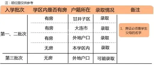 (一)第一、二批次:6月16日上午:8:50----10:50 6月17日上午:8:50----10:50 招生对象: 1.父母房产在学区内且户籍在甘井子区内学生。 2.父母房产在学区内的本市户籍学生。 3.父母房产在学区内,户籍在外地的学生。 4.户籍在本学区内的无房学生。 所需证件: 1.须带学生家长的房产证、户口簿和预防接种证等证件原件以及有家长签字的户口簿学生一页的复印件办理。 2.如果户口簿无法证明学生与家长亲子关系,还需提供家长结婚证和学生出生医学证明原件。 3.因贷款购房暂无房产证的,须提供学生家长购房合同、商品房交款专用发票、贷款合同、保险单、完税凭证等原件。 4.无房产证而租赁房屋者,须提供房管部门开具的学生家长《房屋租赁登记备案证明》及《房屋信息查询表》(市内五区须同时提供市内四区和高新园区房管部门开具的《房屋信息查询表》) (二)第三批次:6月20日(周一)上午:8:50----10:50 招生对象:外来务工人员随迁子女 所需证件:须带有效的《大连市居住证》、《房屋租赁登记备案证明》及《房屋信息查询表》、在连就业证明、户口簿、预防接种证等证件原件及有家长签字的户口簿学生一页的复印件办理。
