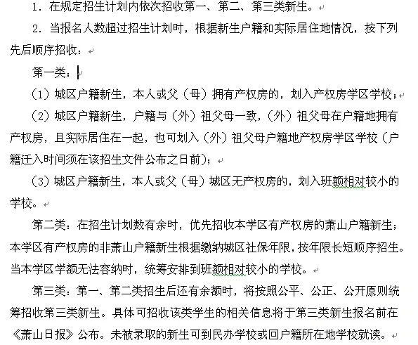 小学新生为2011年8月31日前出生的适龄儿童,初中新生为受完6年小学教育的适龄少年。 第一类:城区(即城厢、北干、新塘、蜀山四街道,以下同)有户籍的新生。 第二类:非萧山城区户籍,家庭生活基础在城区,且本人或父母一方在城区拥有独立产权房的新生。产权房要求:①《房产证》办理时间为2016年4月30日之前;②房产性质为住宅或商住。 第三类:非萧山城区户籍,家庭生活基础在城区并实际居住满一年(凭社区确认的房产租赁证明),且父母一方在城区工作满一年(凭劳动合同或营业执照、社保凭证)的新生。其中非萧山区、非杭州六城区(上城区、下城区、拱墅区、西湖区、江干区、滨江区)和非大江东户籍的新生,其父母一方还须持有效《浙江省居住证》)。