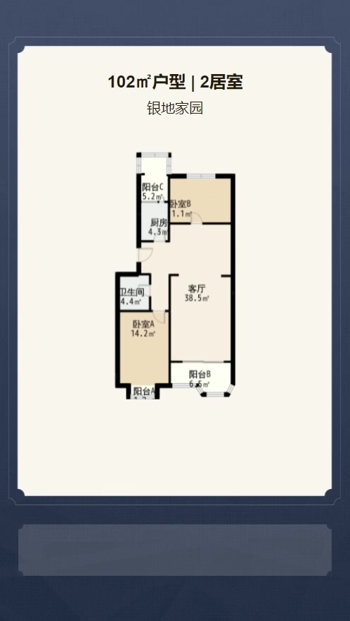 售完银地家园2居室户型图 | 建面:102㎡ | 朝向:南北通透