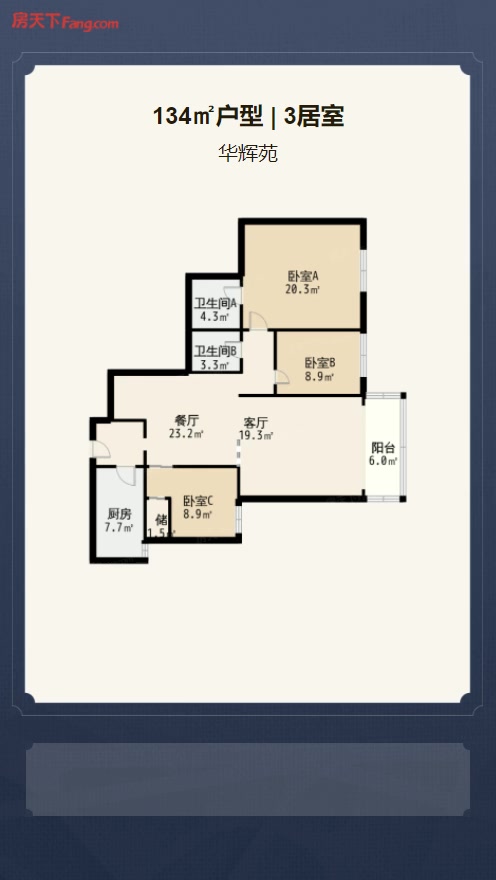售完华辉苑3居室户型图 | 建面:134.3㎡ | 朝向:朝东