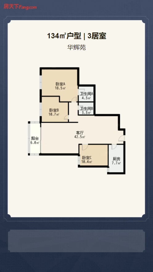 售完华辉苑3居室户型图 | 建面:134.3㎡ | 朝向:朝西