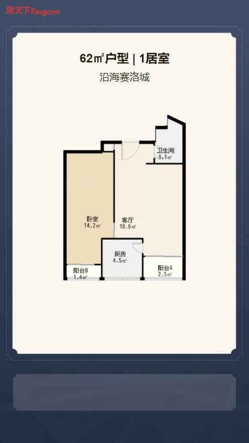售完沿海赛洛城1居室户型图 | 建面:62㎡ | 朝向:朝南