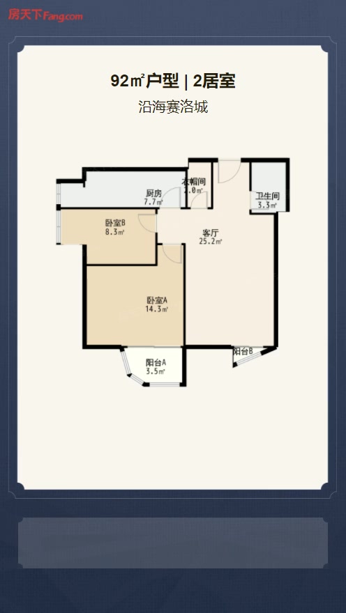 售完沿海赛洛城2居室户型图 | 建面:92.28㎡ | 朝向:西南