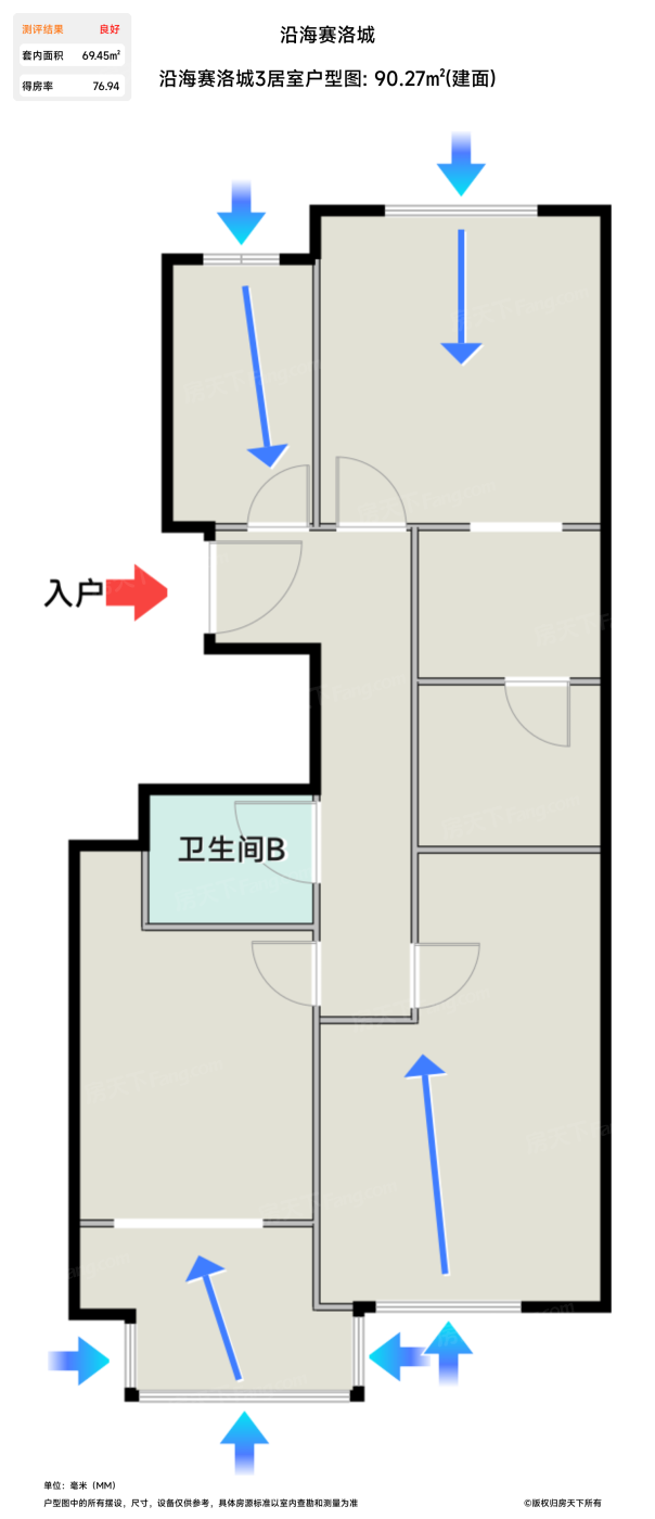 售完沿海赛洛城3居室户型图 | 建面:90.27㎡ | 朝向:南北通透