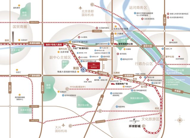 楼盘周边医疗资源较为丰富,直线3km范围内有7个一级及以上医院。其中北京中医药大学东直门医院(通州院区)距离楼盘1.4km,首都医科大学附属北京潞河医院距离楼盘1.2km,北京市通州区中西医结合医院距离楼盘1.4km,为医疗需求提供了保障。楼盘周边3km范围内有19个商场,包括极卓广场、阳光新生活广场(通州店)、华联BHGMall(通州北苑店)、北京通州领展广场、爱琴海购物公园等购物中心,商业配套成熟,完全可以满足日常购物需求。楼盘周边生态环境优越,周边3km范围内有64个公园,距离最近的仅695m,非常方便日常休闲使用。