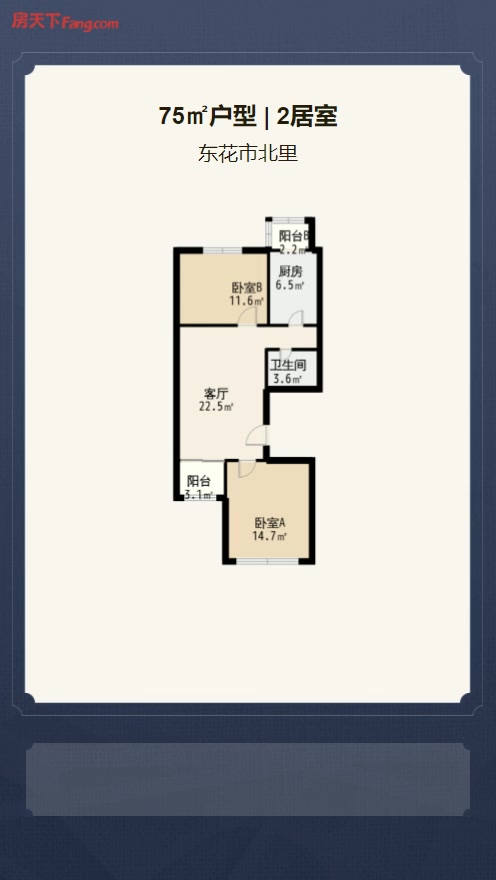售完东花市北里2居室户型图 | 建面:75㎡ | 朝向:南北通透