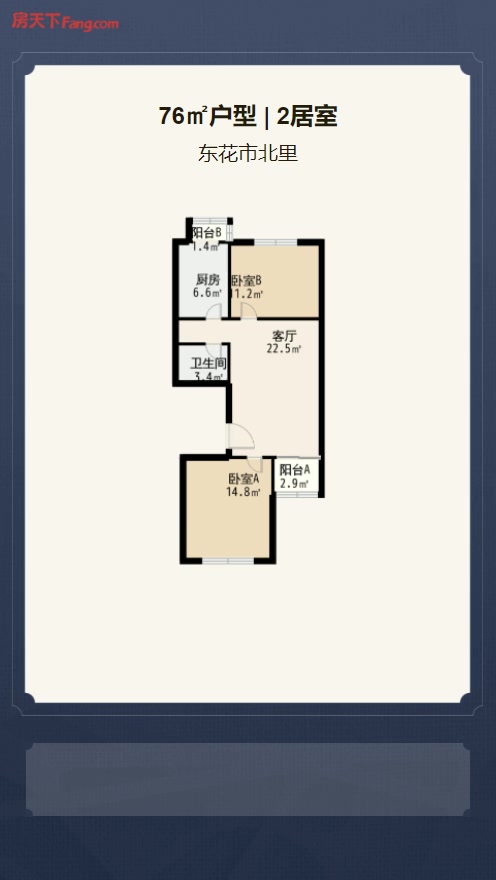 售完东花市北里2居室户型图 | 建面:76㎡ | 朝向:南北通透