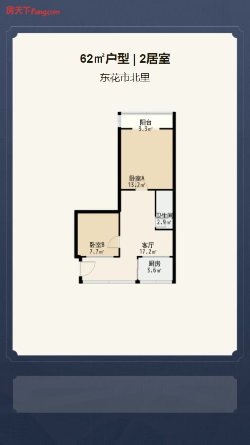 售完东花市北里2居室户型图 | 建面:62㎡ | 朝向:朝北