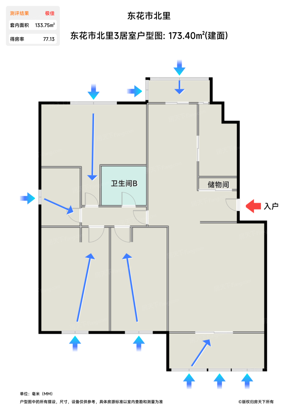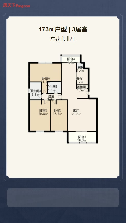 售完东花市北里3居室户型图 | 建面:173.4㎡ | 朝向:南北通透