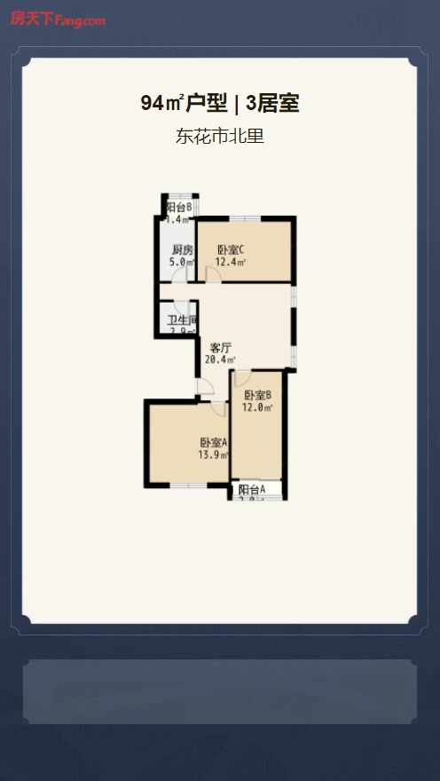售完东花市北里3居室户型图 | 建面:94.3㎡ | 朝向:南北通透