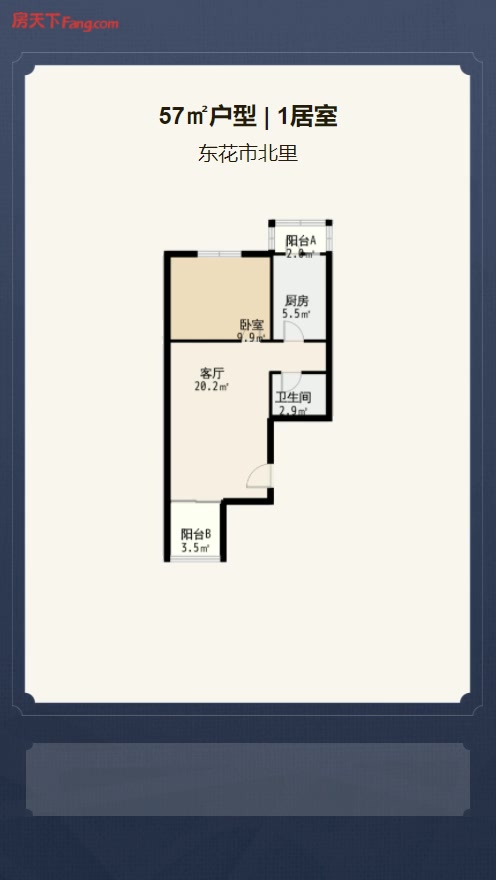 售完东花市北里1居室户型图 | 建面:57.33㎡ | 朝向:南北通透