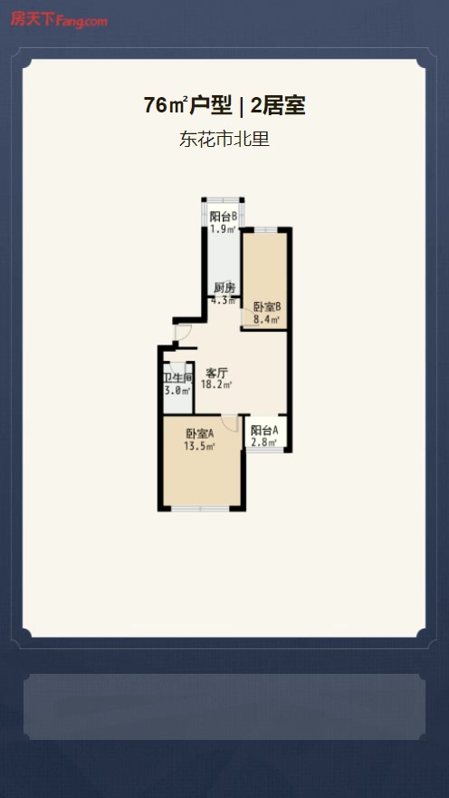 售完东花市北里2居室户型图 | 建面:76.63㎡ | 朝向:南北通透