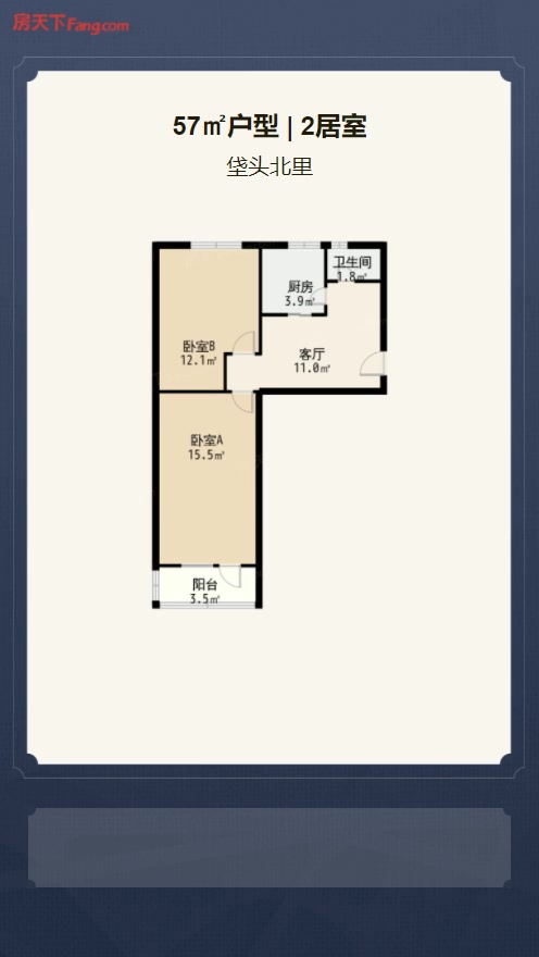 售完垡头北里2居室户型图 | 建面:57.5㎡ | 朝向:南北通透