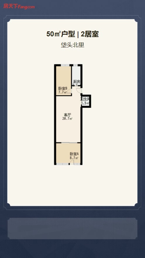 售完垡头北里2居室户型图 | 建面:50.47㎡ | 朝向:南北通透