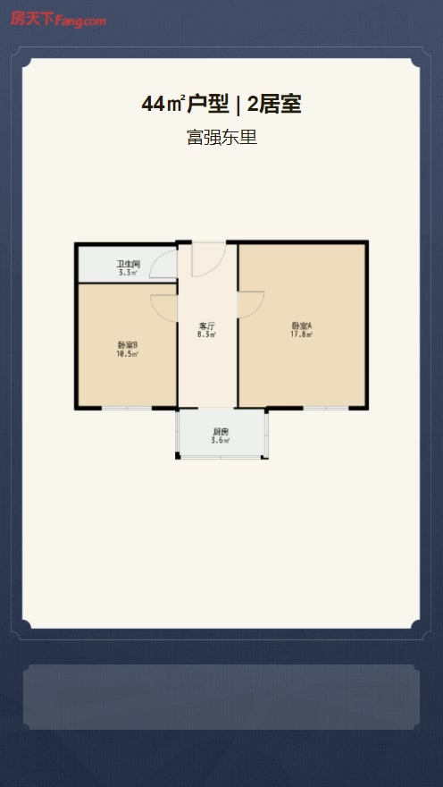 售完富强东里2居室户型图 | 建面:44.47㎡ | 朝向:朝南