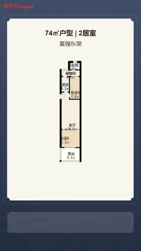 售完富强东里2居室户型图 | 建面:74.08㎡ | 朝向:朝南