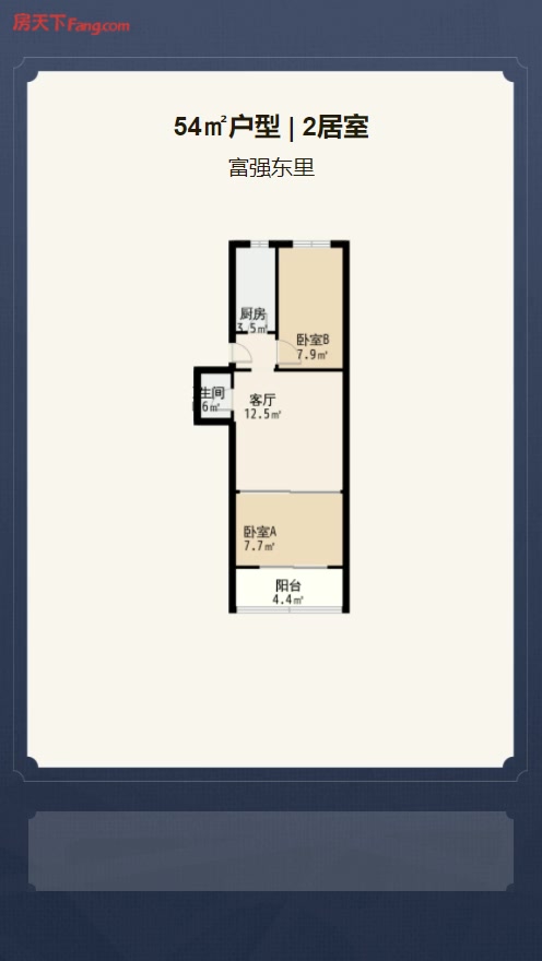 售完富强东里2居室户型图 | 建面:54.44㎡ | 朝向:南北通透