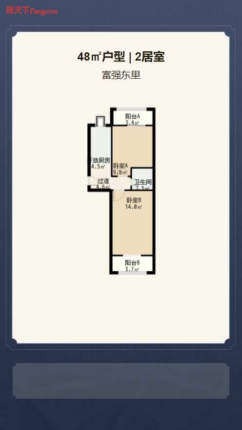 售完富强东里2居室户型图 | 建面:48.43㎡ | 朝向:南北通透