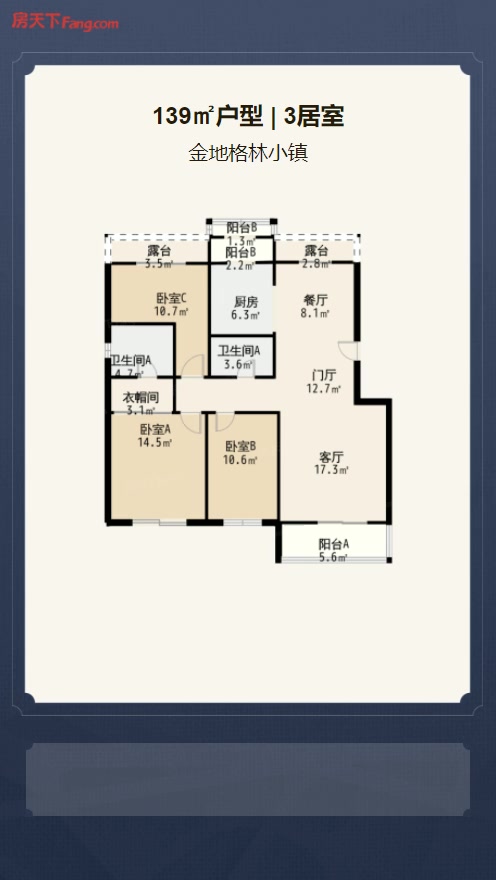 售完金地格林小镇3居室户型图 | 建面:139.27㎡ | 朝向:南北通透