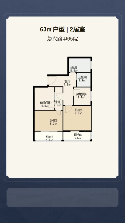 售完复兴路甲65院2居室户型图 | 建面:63㎡ | 朝向:朝南