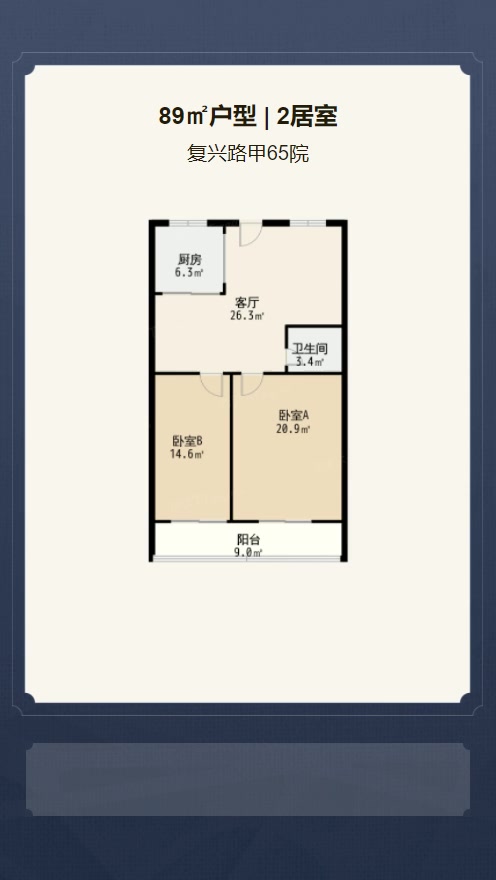 售完复兴路甲65院2居室户型图 | 建面:89.5㎡ | 朝向:南北通透
