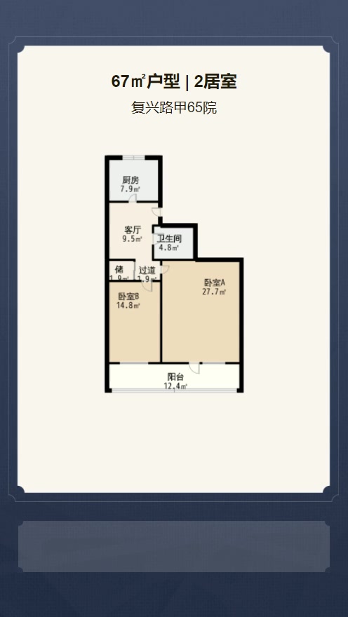 售完复兴路甲65院2居室户型图 | 建面:67.4㎡ | 朝向:朝南