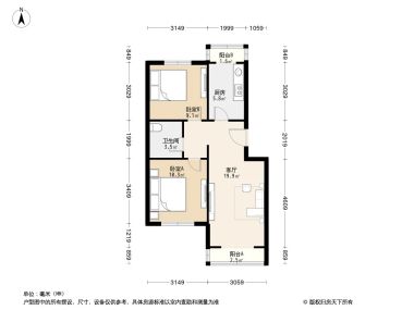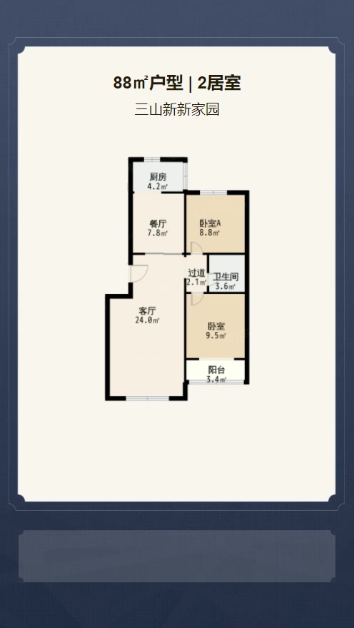 售完三山新新家园2居室户型图 | 建面:88.8㎡ | 朝向:南北通透