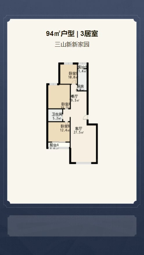 售完三山新新家园3居室户型图 | 建面:94.56㎡ | 朝向:南北通透