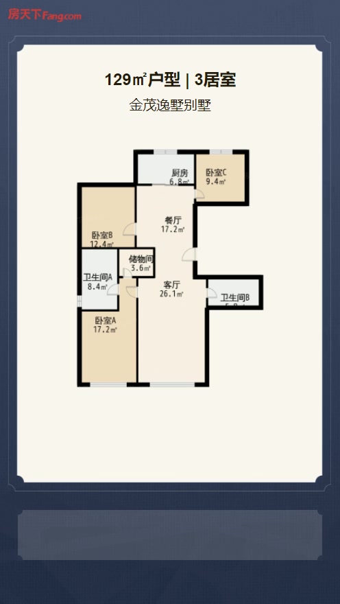 售完亦庄金茂悦别墅3居室户型图 | 建面:129.99㎡ | 朝向:南北通透