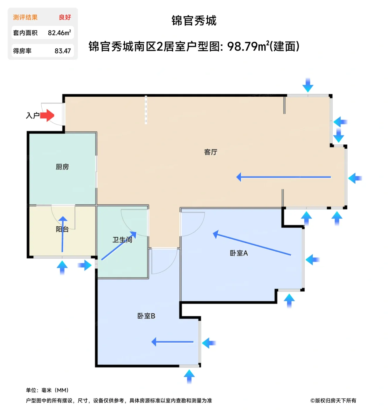 售完锦官秀城南区2居室户型图 | 建面:98.79㎡ | 朝向:朝东