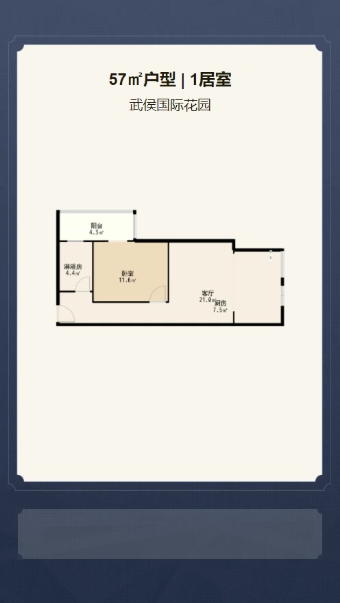 售完武侯国际花园1居室户型图 | 建面:57㎡ | 朝向:朝南