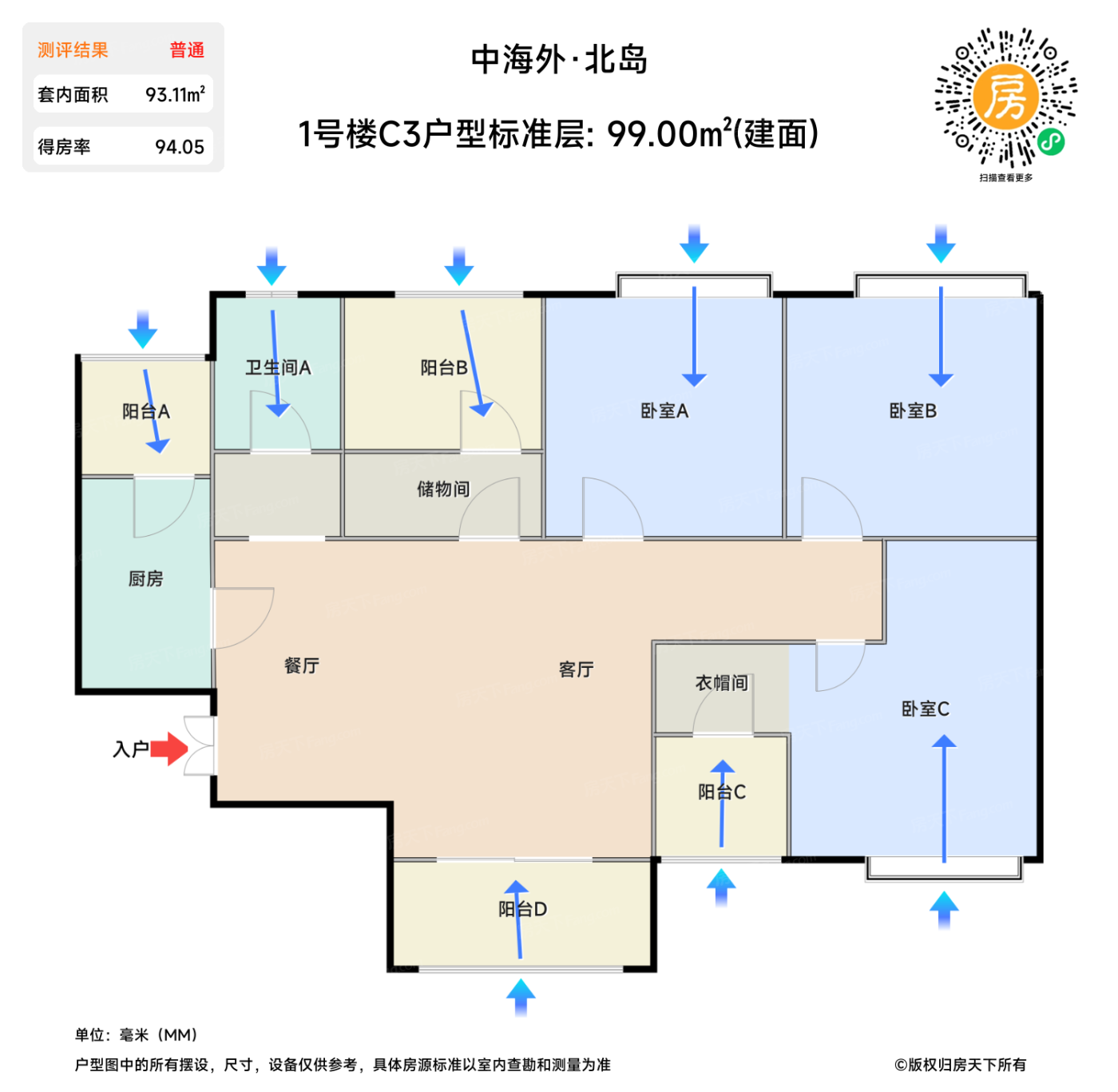 在售1号楼C3户型标准层 | 建面:99㎡ | 朝向:
