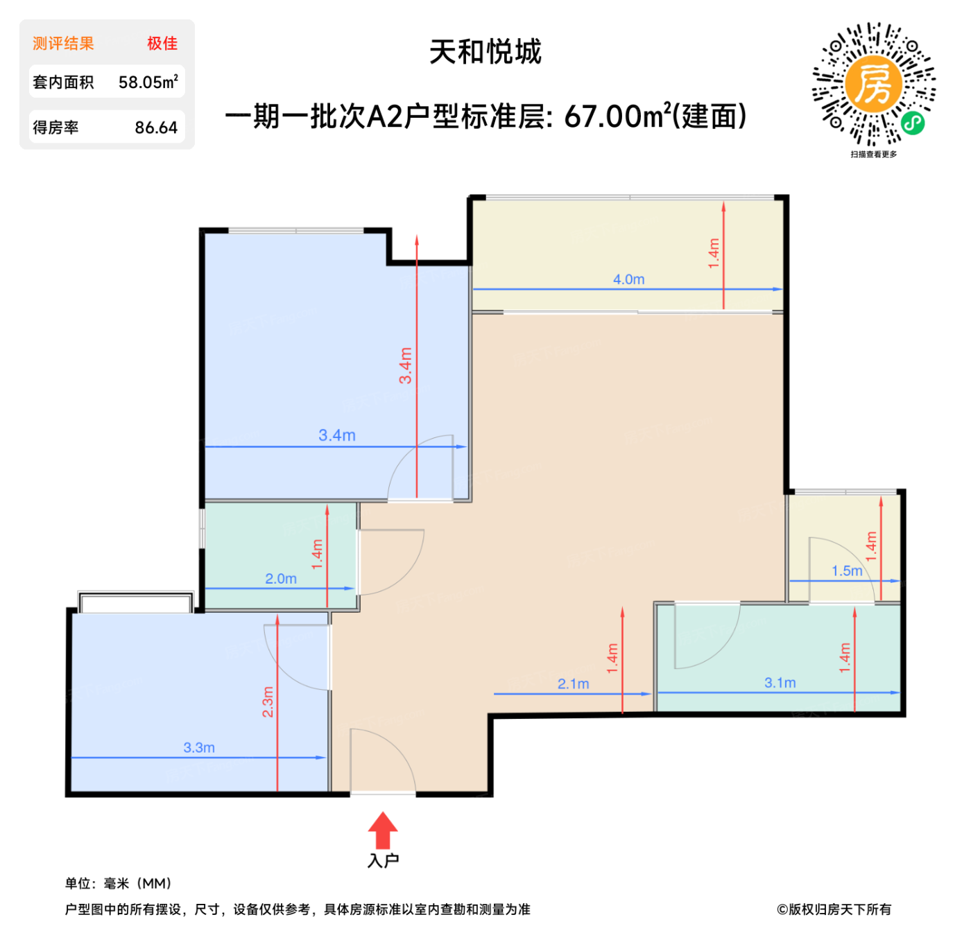 | 卧室A | 11.1 | 3.4 | 3.4 | 良好 |